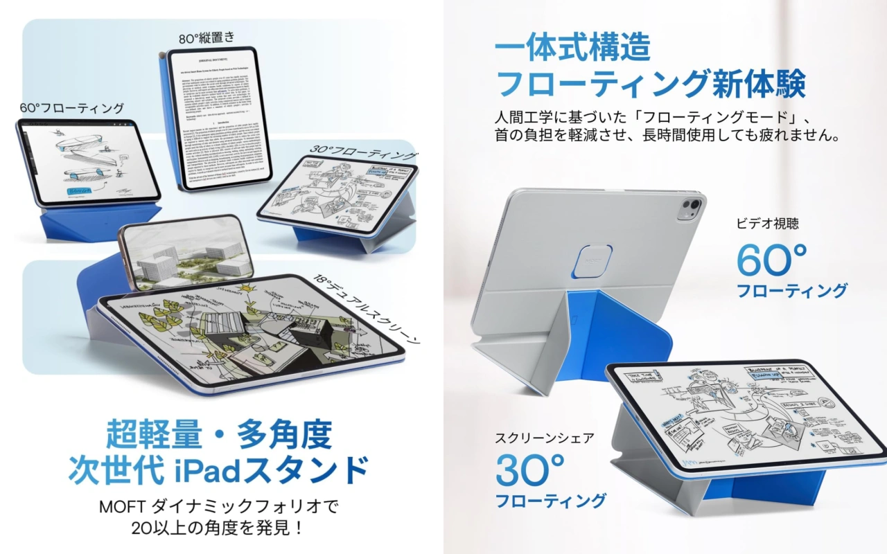 MOFTが20種類以上の折り方でiPadを最適な角度に設置できるスタンド「MOFTダイナミックフォリオ」を発売しています。詳細は以下から。