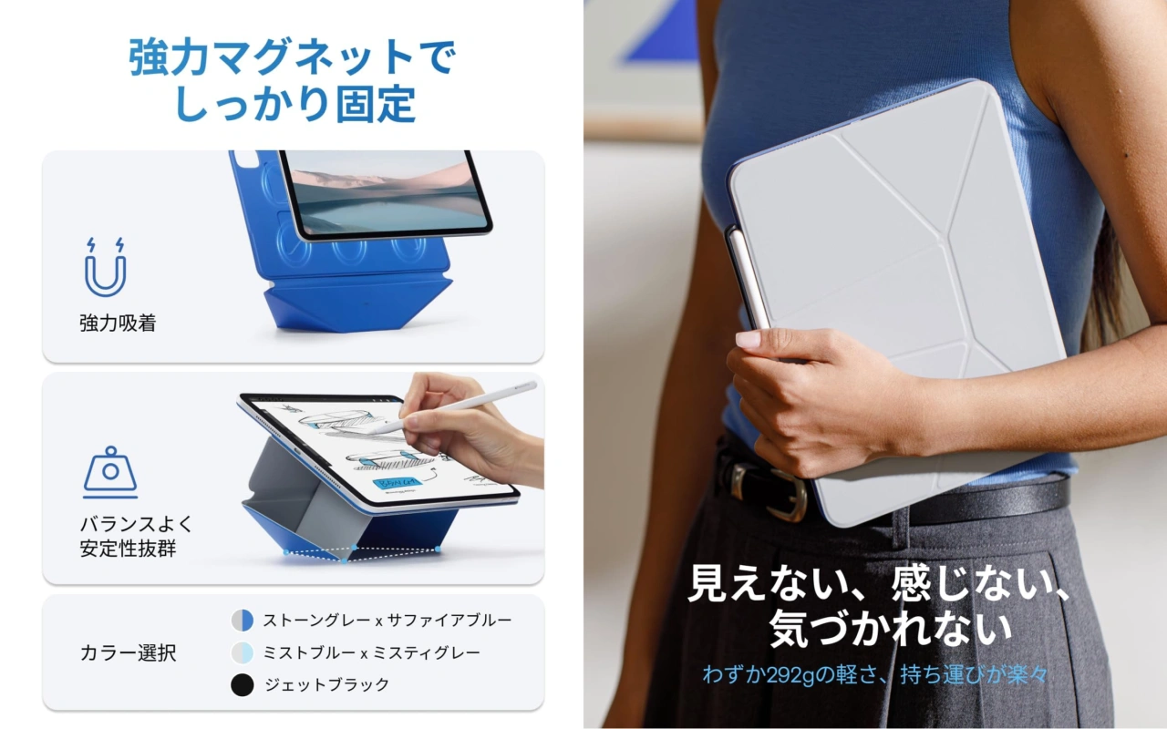 MOFTダイナミックフォリオは、既にMOFTが販売している多くのiPhone/iPadスタンドと同じようにマグネットでiPadに装着できるケース兼スタンドで、ケース内にはN52マグネットが内蔵され、iPadに確実に固定できる他、軽量で高耐久のグラスファイバーと高耐久のヴィーガンレザーを採用し重さはわずか292g*と軽量で持ち運びやすいデザインになっています。