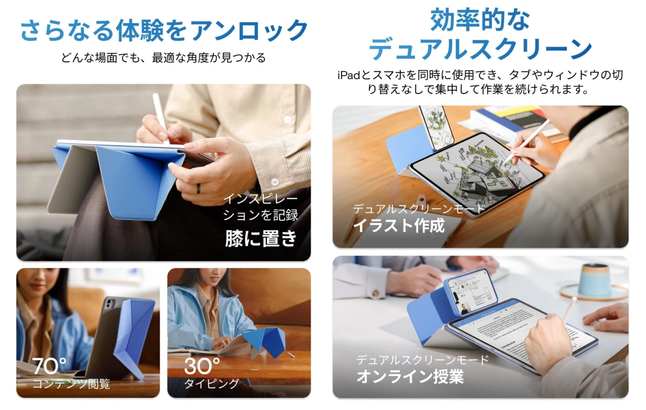 MOFTの最新作「ダイナミックフォリオ」は、従来のスタンドの概念を覆す次世代のiPadスタンド&ケースです。縦置き・横置きが自由自在で、20種類以上の使い方に対応し、あなたにとって最適な角度が必ず見つかります。