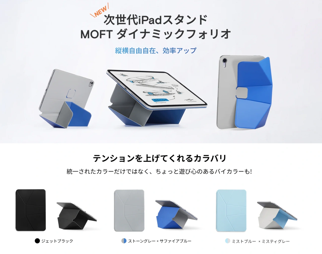 MOFTダイナミックフォリオは各iPad毎にモデルが異なり、価格はiPad mini (第6世代)/(A17 Pro)モデルが5,980円、iPad (第10世代)/(A16)モデルや11インチiPad Air/Proモデルが7,880円、一番高い13インチiPad Pro/Airモデルが9,990円で、カラーはジェットブラック、ストーングレー、ミントブルーの3種類から選択できるようになっています。