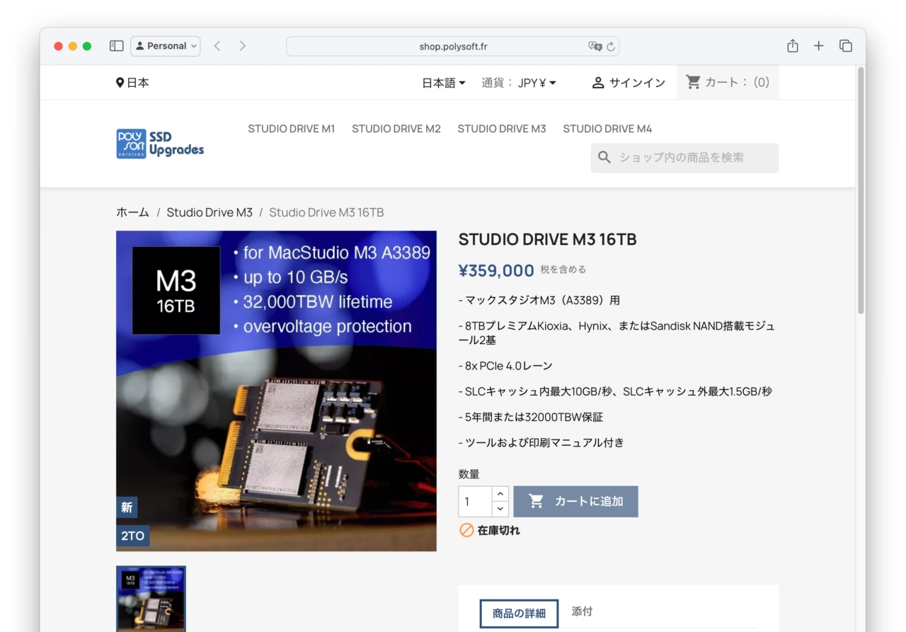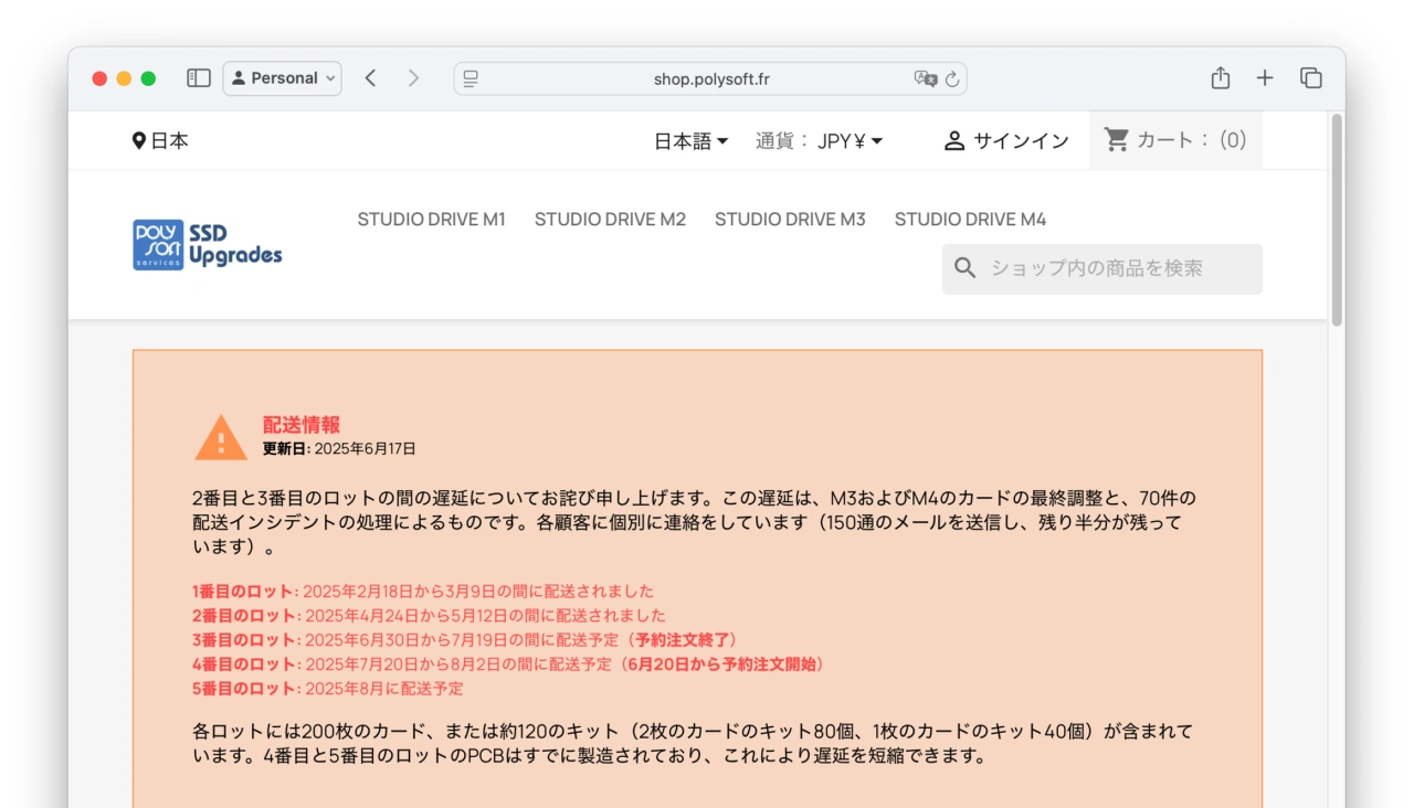 Studio Drive M3/M4は5年または4,000~32,000TBW保証付きで、Polysoft Servicesストアでの価格はストレージサイズにより以下の通りとなっていますが、Polysoft Servicesストアでは、Studio Drive M1/M2の発送遅延とM3/M4カードの最終調整で、各ロットの発送に遅延が発生しており、現在予約購入が出来ない状態ですが、08月頃には問題が解決し通常発送できるようになるようです。