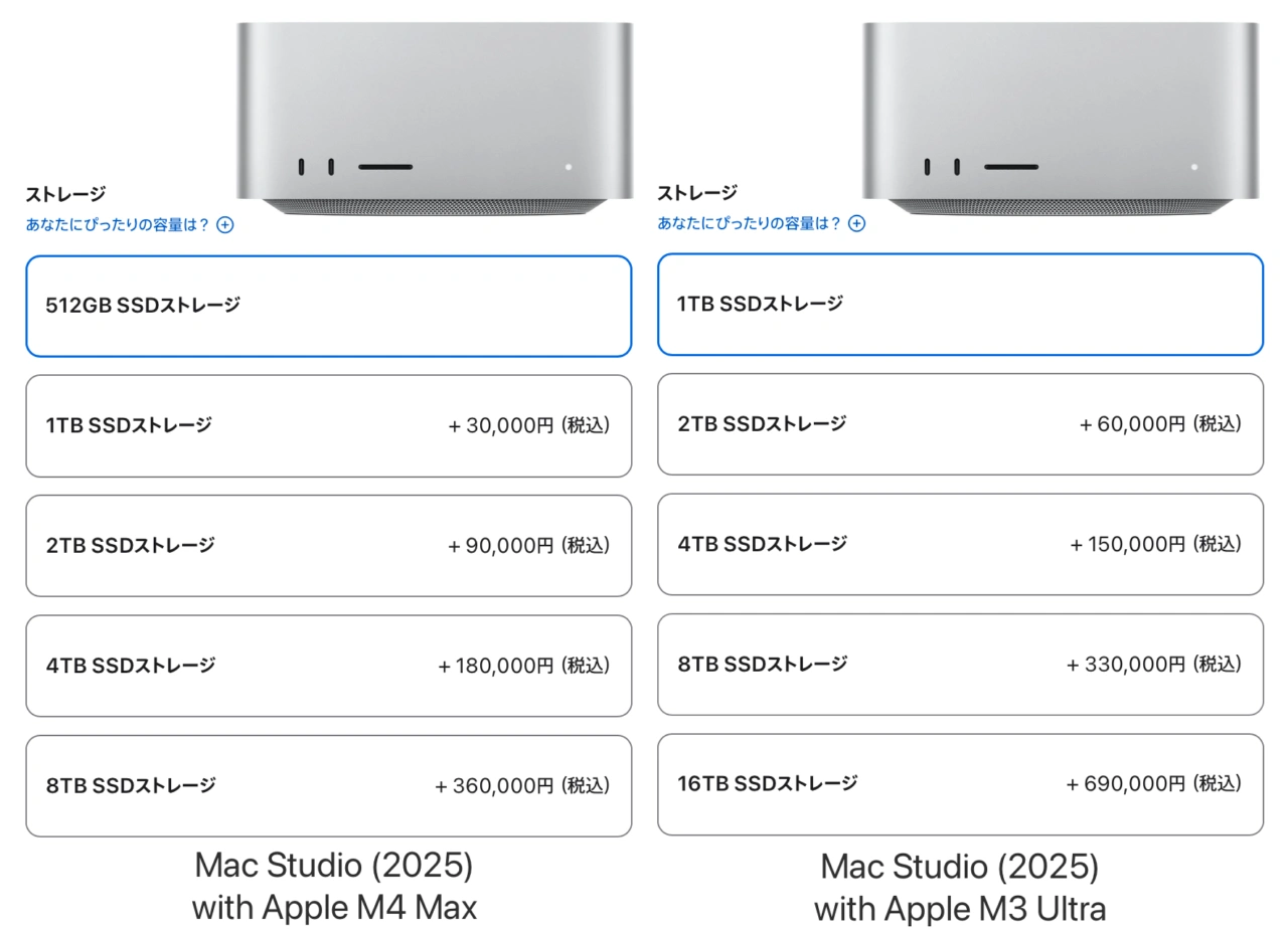 Apple StoreでのMac Studio (2025)のSSD CTO価格