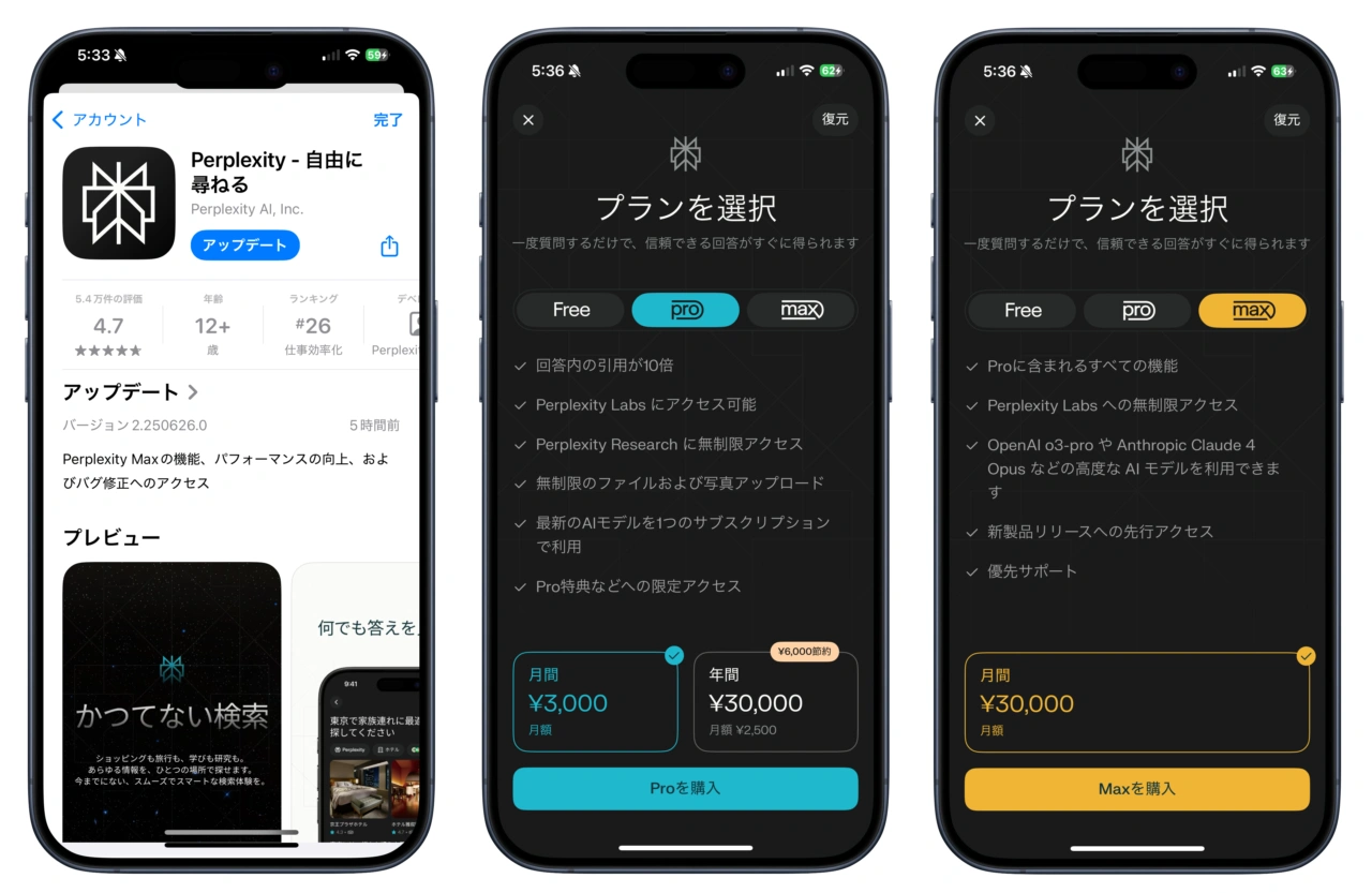 Perplexity Maxの価格はChatGPT Proプランと同じ月額200ドル/月額30,000円で、現在はWebとiOSアプリ*からしか利用できませんが、PerplexityはPerplexity Proプランでは足りないリサーチなどを行うビジネスマンや研究者、ライターに最適なプランだとコメントしているので、Perplexity Proプランでは物足りない方はチェックしてみてください。
