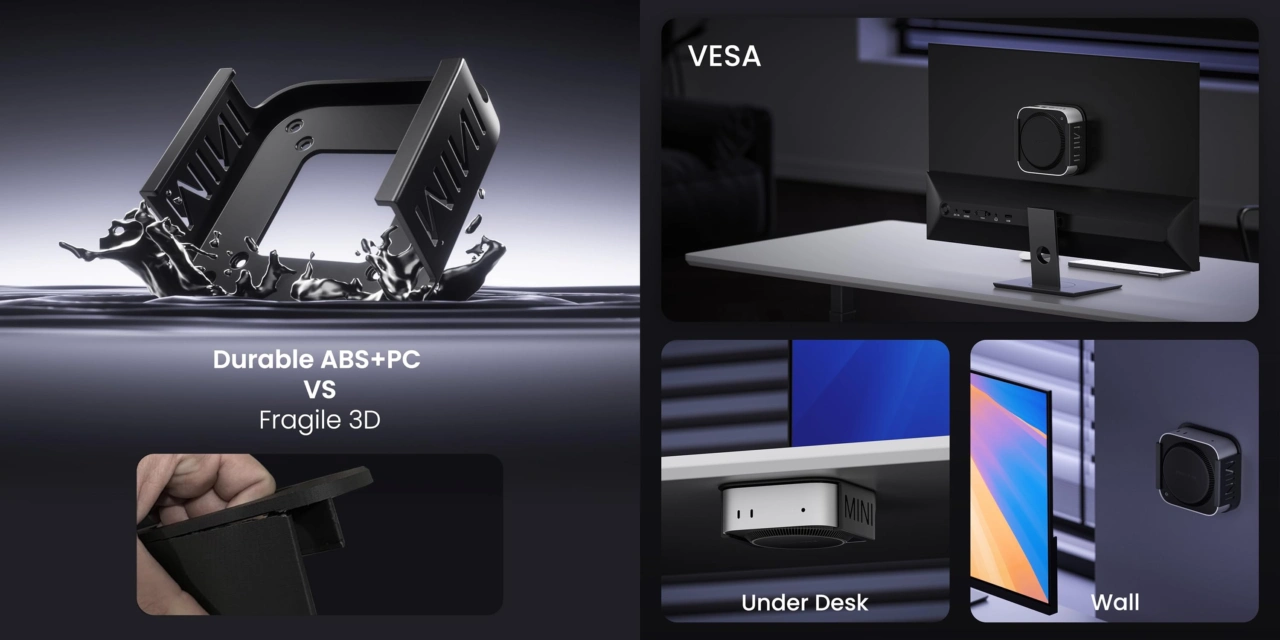 Fasgear Mac Mini M4 2024 Mountは、アルミニウム合金ではなく、ABS+PC素材を使用した射出成形設計で、75×75mmおよび100×100mmのVESAマウント規格に対応し、Mac miniをモニター裏や机の下に設置することが可能で、