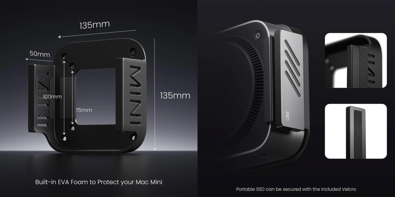 サイズは約135 x 135 x 50mmで、内部にはMac miniが滑り落ちるのと共振を止めるEVAフォームが内蔵されており、側面はフラットで付属のマジックテープをポータブルSSDに接続することでMac miniとポータブルSSDを一緒に設置することが可能になっています。