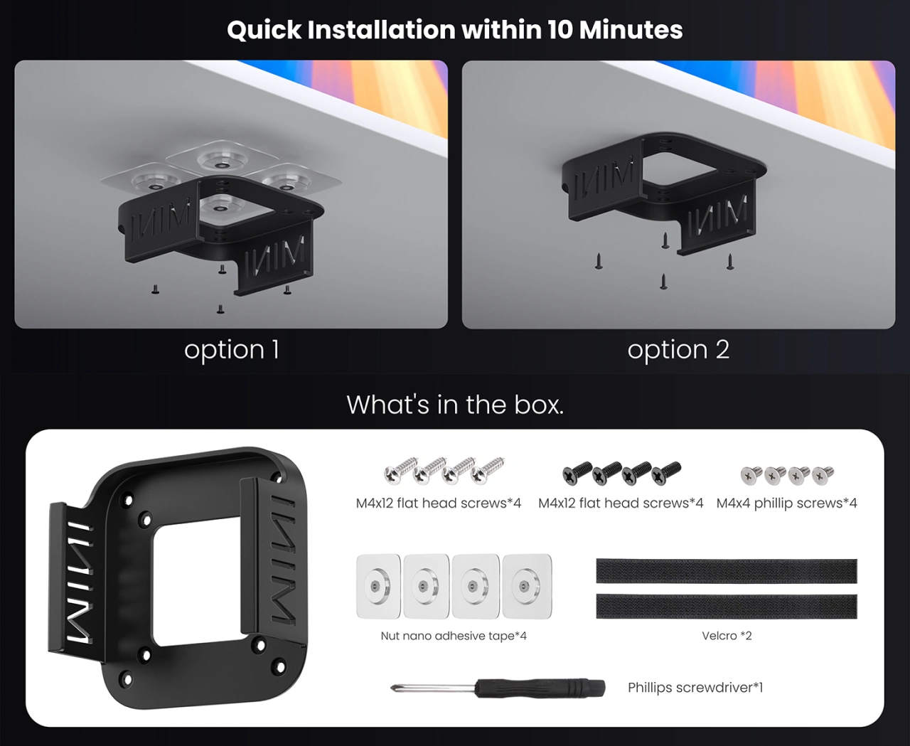 パッケージにはマウント本体の他に、M4×12ラウンドヘッドネジ x4本、M4×12フラットヘッドネジ x4本、M4x4ネジ x4本、机にネジ穴を開けず貼り付けられるナット付き両面粘着テープ x4枚、マジックテープ x2枚、プラスドライバー 1本が付属し、価格はアルミニウムモデルより安い2,399円となっているので、Mac mini用マウンタを探していた方はチェックしてみてください。