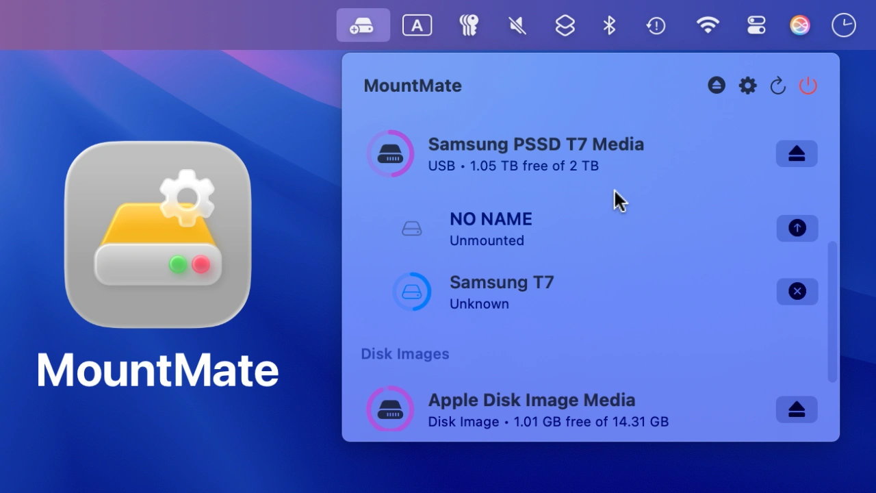 MountMate is a lightweight macOS menu bar utility that lets you mount and unmount external drives with a single click – no Terminal, no Disk Utility, no hassle.