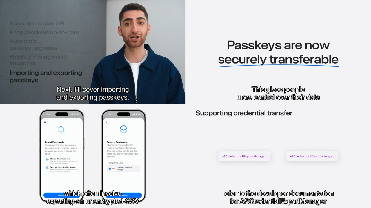 今年の秋にもリリースを予定しているmacOS 26 TahoeやiOS/iPadOS 26、visionOS 26では、新たにASCredentialExportManager/ASCredentialImportManagerというAPIが用意され、パスワードやパスキーなどを暗号化されてないCSV/JSONファイルへ書き出さずに安全にデータが移行できるようになるそうです。