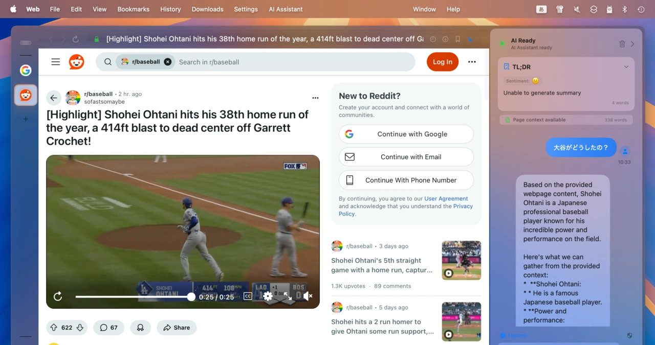 現在、Safariを含む多くのブラウザにはAIを利用したWebページの要約や解析機能が実装されていますが、同様の機能をAppleの機械学習フレームワークMLXとWebKitを利用し実装したオープンソースのブラウザ「Web – macOS AI Browser」のBeta版がリリースされています。