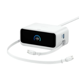 巻取り式USB-CケーブルとUSB-Cポートの出力はMacBook Proの急速充電も可能な最大100Wで、前面には合計出力や各ポートからの出力状況、本体温度のリアルタイム表示、そしてデバイスの温度を1秒間に約80回を検知して出力を制御するActiveShield 3.0の情報を表示できる1.3インチディスプレイを搭載。