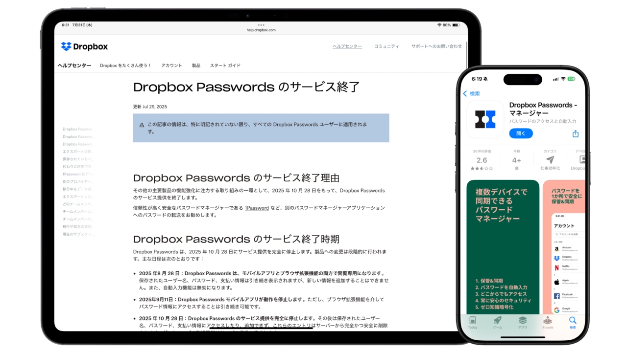 ▶Dropbox Passwords モバイルアプリが動作を停止します。ただし、ブラウザ拡張機能を介してパスワード情報にアクセスすることは引き続き可能です。 - 2025年10月28日: