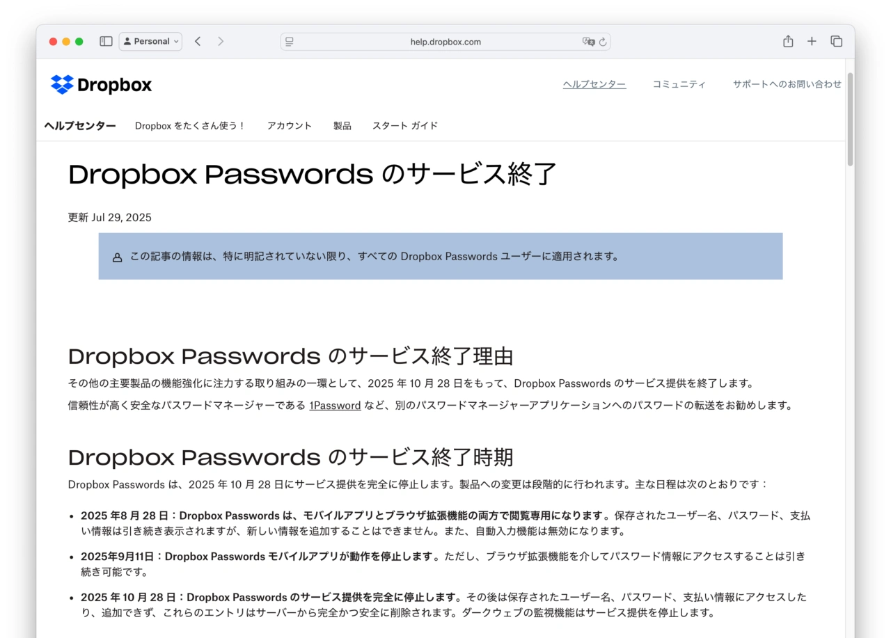Dropbox Passwordsサービスの変更は段階的に行われ、08月28日にiPhoneなどのモバイルアプリとSafariなどのブラウザ機能拡張の両方が閲覧専用になり、09月11日にはモバイルアプリの動作が停止し、10月28日にはサービスの提供が完全に終了するそうです。