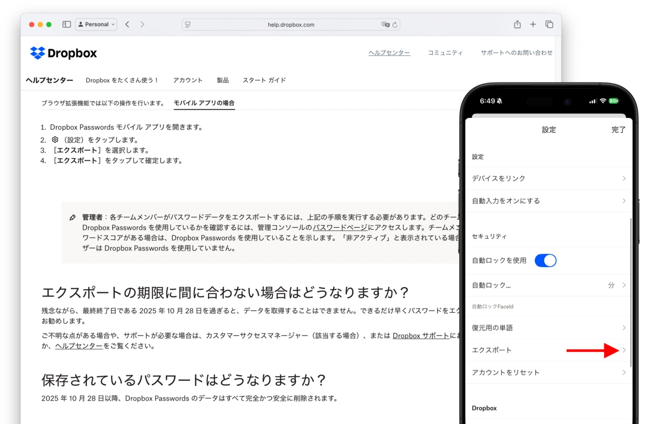 サービス終了後は、保存されたユーザー名やパスワード、支払い情報へのアクセスや追加が不可能となり、これらのエントリはサーバーから完全かつ安全に削除されるそうで、DropboxはユーザーにDropbox Passwordsサイトやアプリの設定(⚙️) → [エクスポート]からデータをエクスポートするように求めているので、ユーザーの方はサポートページをチェックしてみてください。