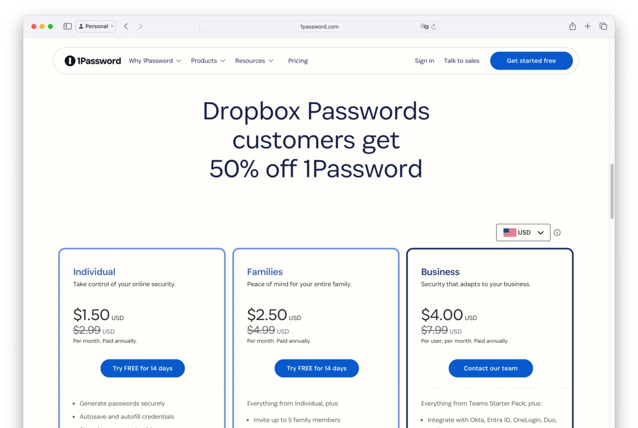 DropboxはDropbox Passwordsユーザーに対し、1Passwordと協力してDropbox Passwordsから1Passwordサービスへシームレスに移行できるよう移行方法と初年度サブスクリプションの50%OFFプロモーションの提供を開始しているので、ユーザーの方は登録したメールアドレスをチェックしてみてください。