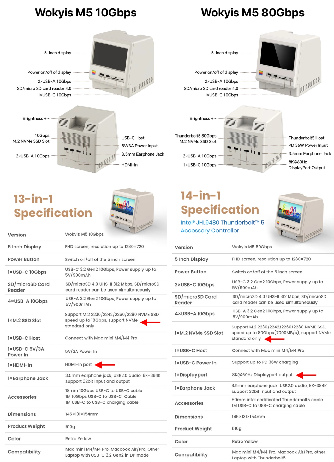 Retro Design, 14-in-1 Docking Station, 5-inch HD Display, compatible with Thunderbolt3/4/5, up to 8TB SSD Storage, 8K@60Hz DisplayPort