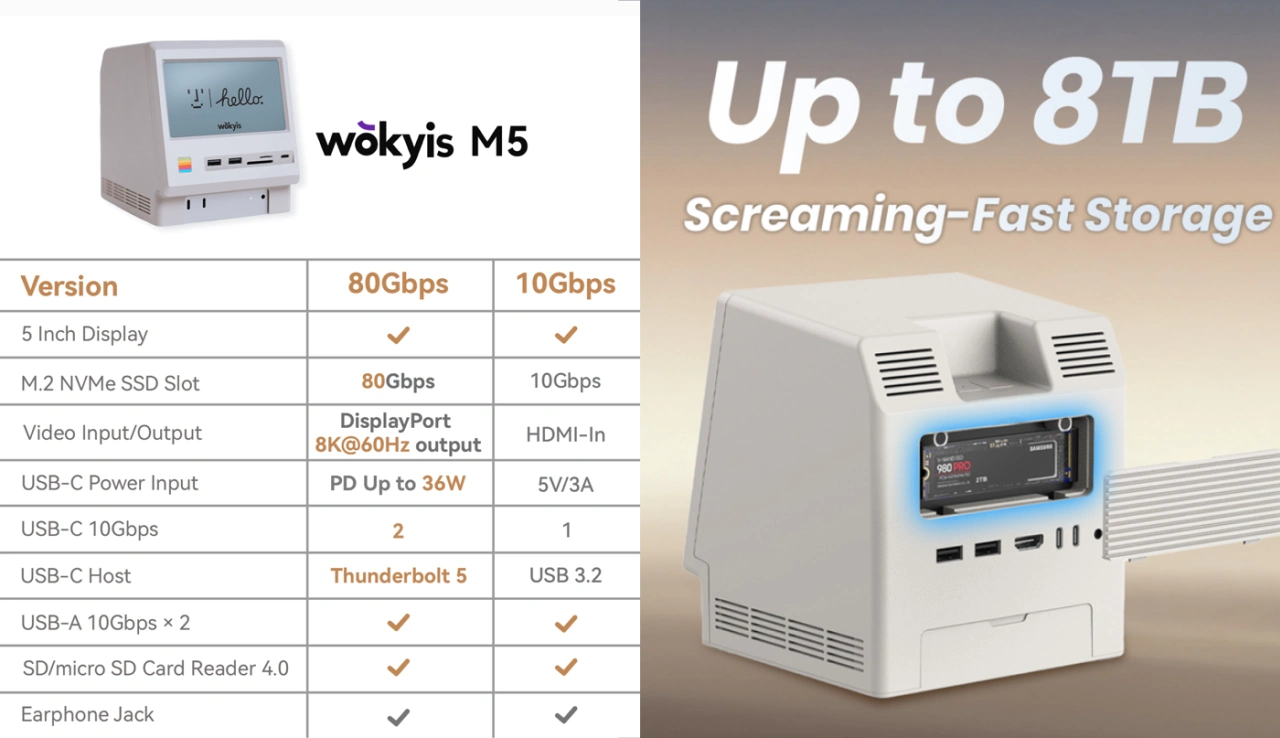 また、Wokyis M5にはフロントにUSB-C 3.2 Gen 2 x1とUSB-A x2ポート、UHS-II対応のSD/MicroSDカードリーダー、背面にM.2 NVMe SSDスロット x1、USB-A x2、3.5mmオーディオジャック x1が搭載されており、ホスト接続がUSB 3.2 Gen 2対応のWokyis M5 10GbpsはHDMI-INポートとUSB-C PD-IN (5V/3A)、Thunderbolt 5対応のWokyis M5 80Gbpsは最大8K@60Hz出力可能なDisplayPort x1とUSB-C 10Gbps x1、USB-C PD-IN (36W)が搭載さています。