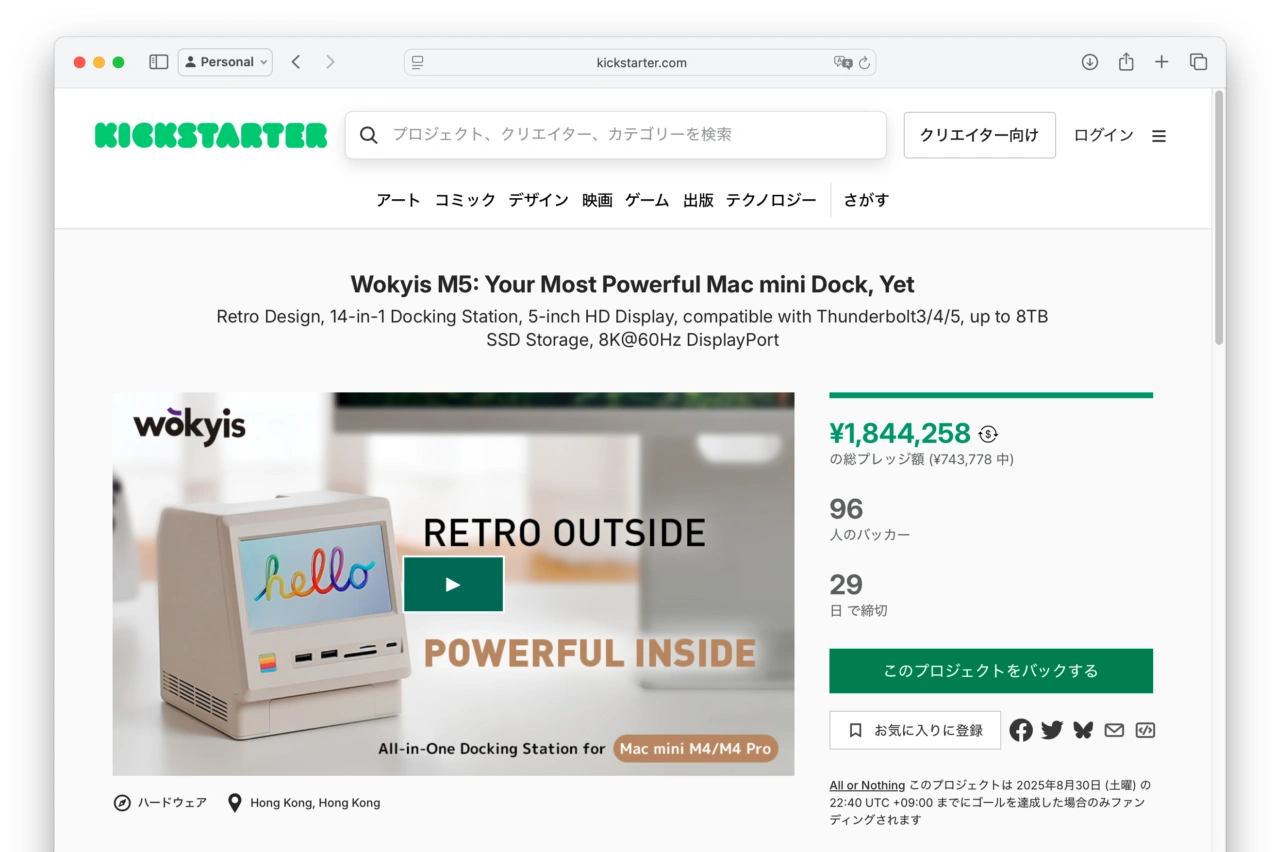 中国広東省深圳市の周辺機器メーカーWokyisは2025年04月、Apple M4/M4 Proチップを搭載したMac mini (2024)専用のドッキングステーション「Wokyis M5: Retro Outside, Powerful Inside (以下、Wokyis M5)」を発表しましたが、このWokyis M5の発売キャンペーンがクラウドファンディングサイトKickstarterで開始されています。