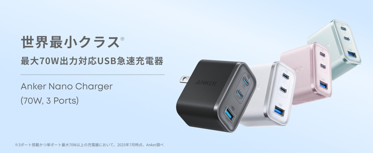 Anker Japanが最大70W出力&3ポート搭載のUSB急速充電器で世界最小クラスとなる「Anker Nano Charger (70W, 3 Ports)」を発売しています。詳細は以下から。