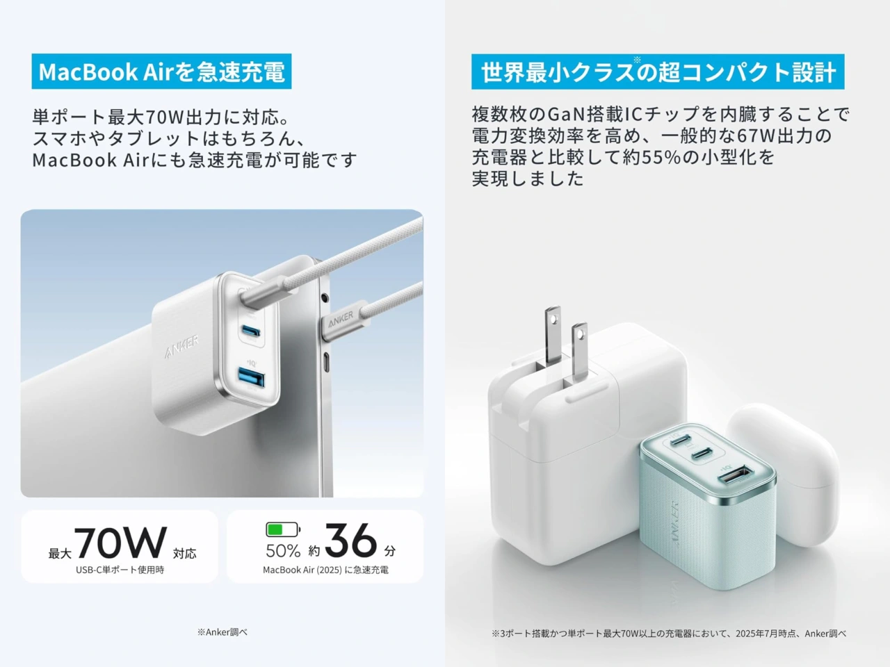 単ポート最大70W出力に対応。スマホやタブレットはもちろん、MacBook Airにも急速充電が可能です。[…]複数枚のGaN搭載ICチップを内臓することで電力変換効率を高め、一般的な67W出力の充電器と比較して約55%の小型化を実現しました。