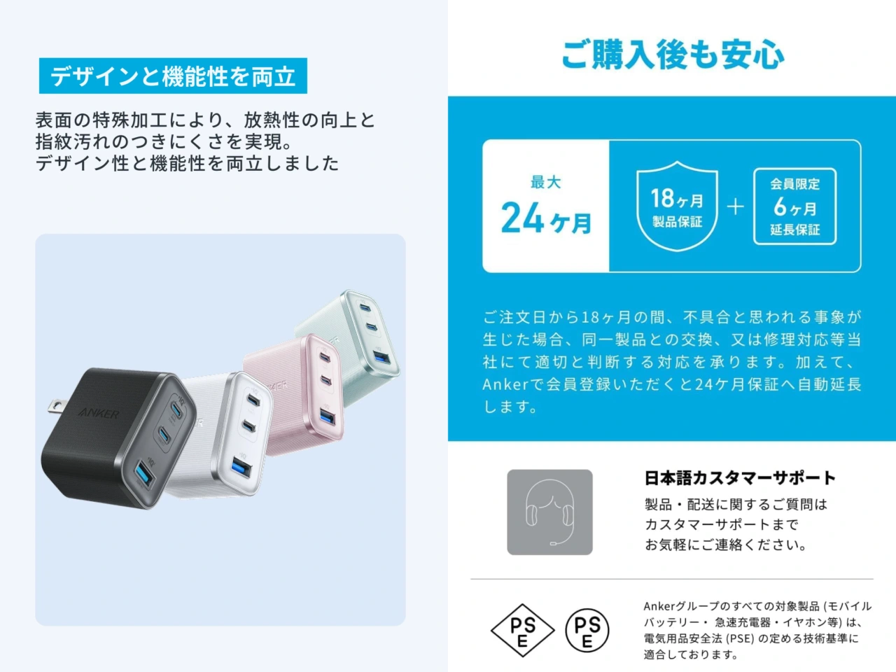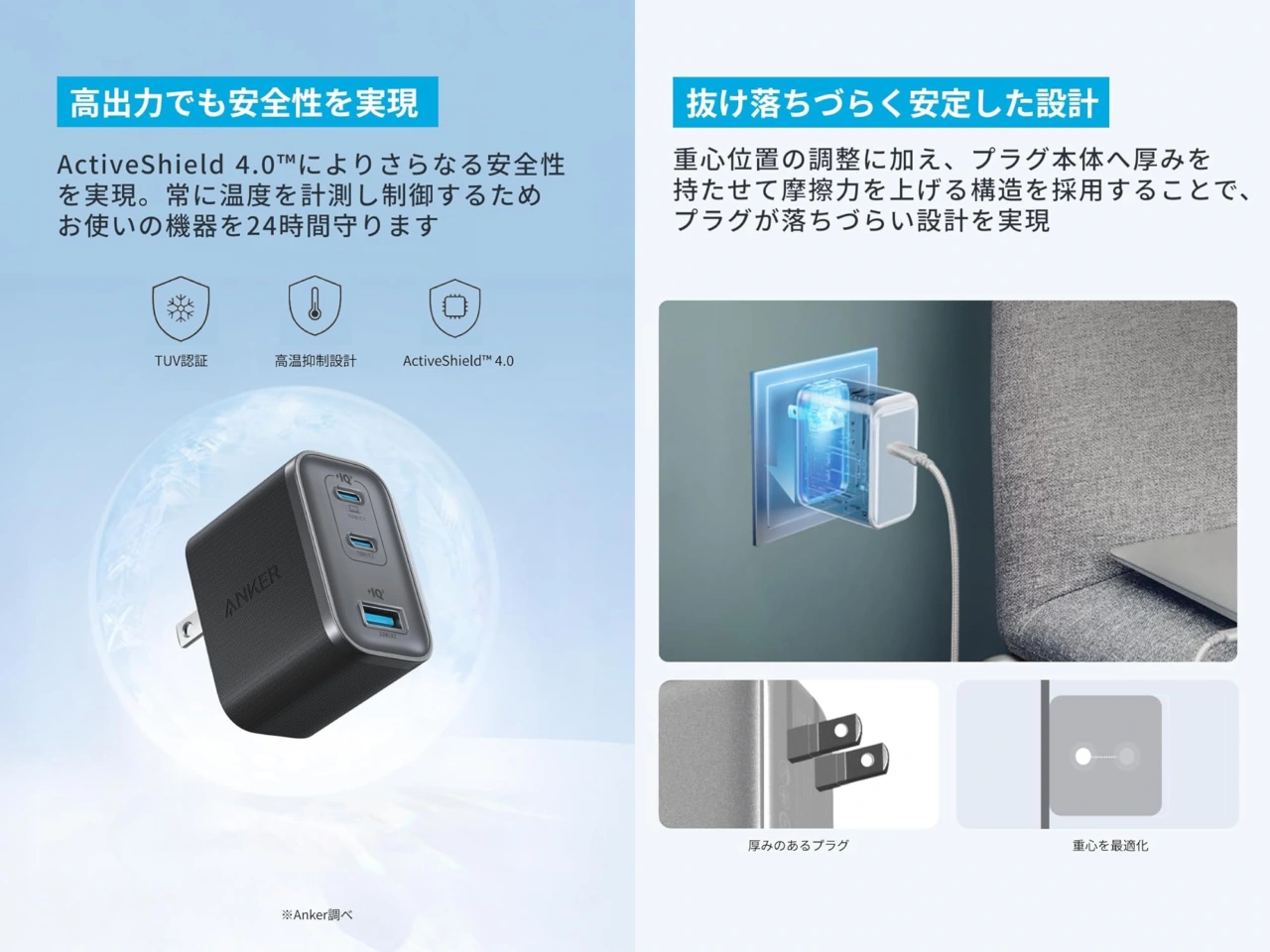 また、2022年に発売したAnker 737 Charger (GaNPrime 120W)で壁のコンセントポートにUSB充電器を挿しておくと、充電器の自重でコンセントからUSB充電器が抜け落ちてしまうという失敗を活かし、重心位置を調整&プラグの厚みをもたせ摩擦力を上げたことで落ちづらくなっており、接続されたデバイスの温度を常時監視するActiveShield 4.0にも対応。