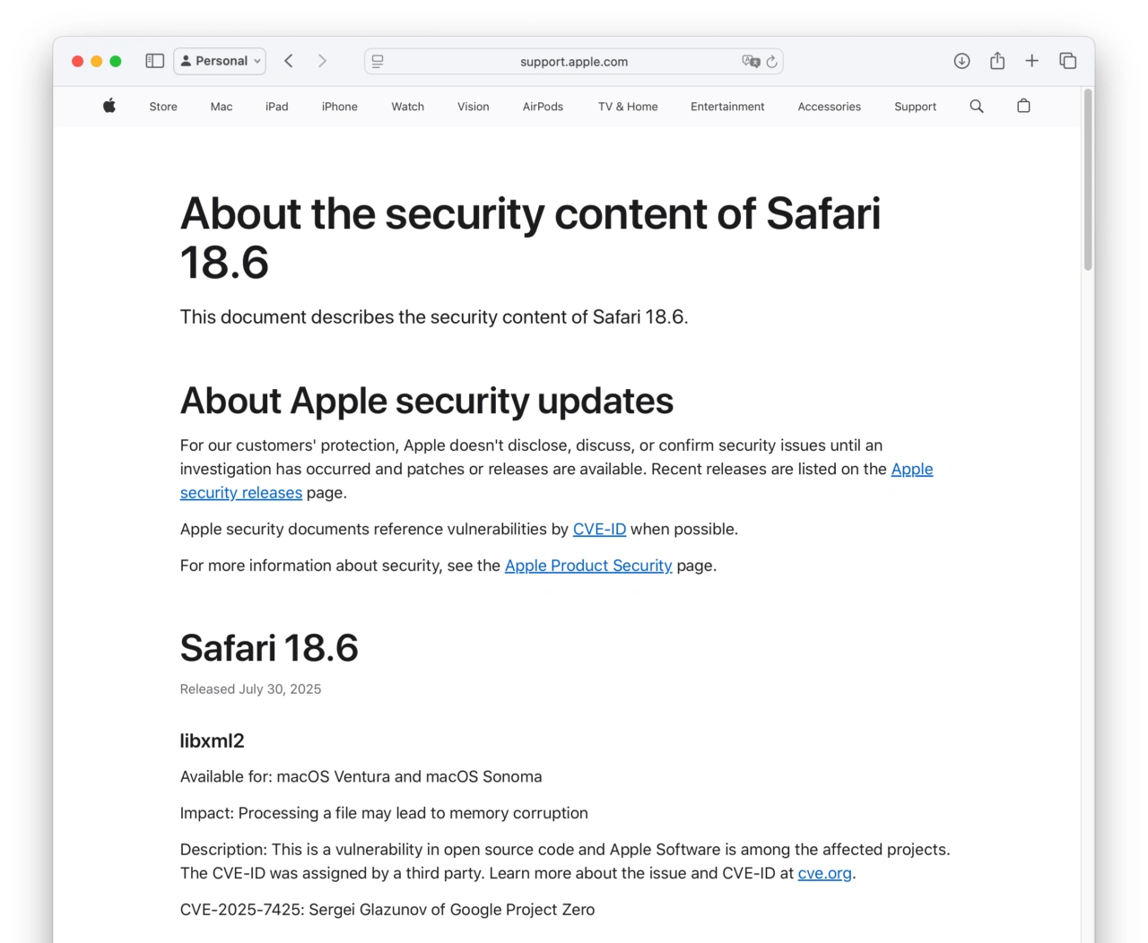 Appleが公開したセキュリティコンテンツによると、Safari v18.6ではiOS/iPadOS 18.6のWebKitと同じく悪意のあるWebコンテンツを処理することでアドレスバーの偽装やユーザー情報の漏洩、DoSによるアプリのクラッシュなど、合計17件が修正されているので、macOS VenturaとSonomaユーザーの方はチェックしてみてください。