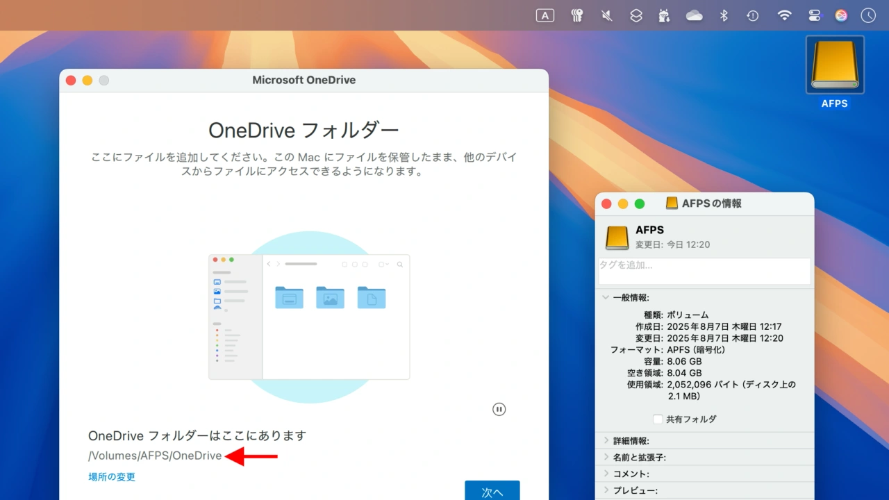 OneDrive for Macのファイル保存仕様が緩和されたことで、FileVaultで暗号化されたAPFSフォーマットのストレージなら外付けHDD/SSDやUSBメモリにもOneDriveファイルの保存先を指定できるようになったので試してみたところ、セットアップ画面の[OneDriveフォルダー]でフォルダーの保管場所をAPFS(暗号化)の外部ドライブに指定しファイルを保存できたので、OneDriveフォルダーでMacのホームボリューム容量が圧迫されている方は試してみてください。