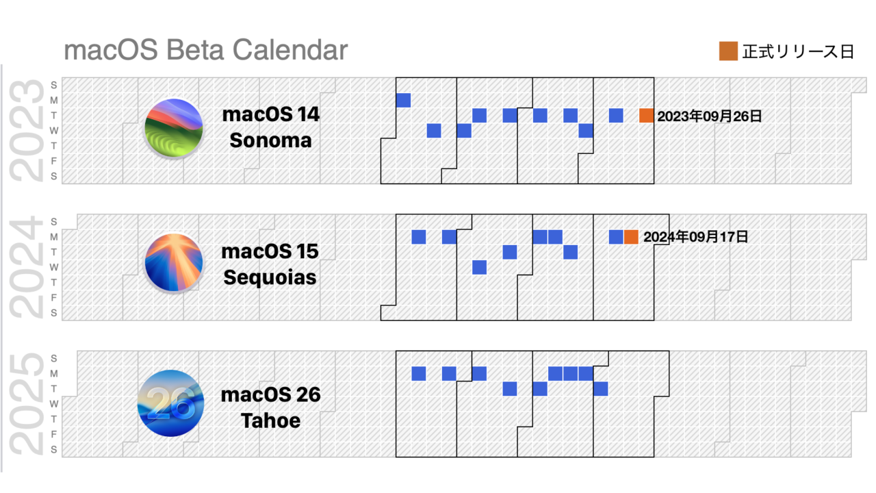 なお、macOS 26 TahoeやiOS/iPadOS 26のリリース日は「今年の秋」としか発表されていませんが、例年通りならば来週09月10日に開催されるスペシャルイベント「Awe dropping.」でiPhone 17シリーズが発表され、同時にmasOS 26やiOS/iPadOS 26の正式リリース日と発表されるはずなので、09月中旬から後半には正式にリリースされると思われます。