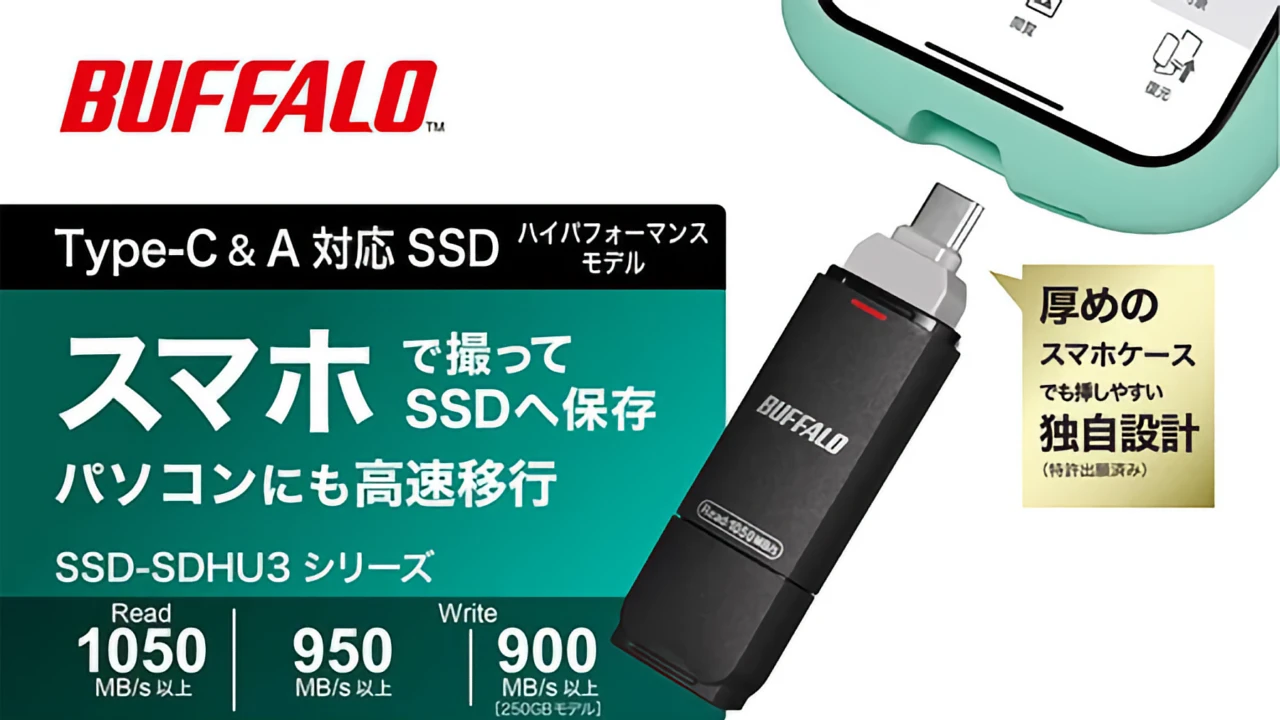 株式会社バッファローは2025年08月20日、スマートフォンなどの写真や動画を簡単に転送&保存できるUSB Type-CとType-A端子を備えたスティック型SSD「SSD-SDHU3」シリーズとエントリーモデルの「SSD-SDU3」シリーズを09月中旬に発売すると発表しましたが、このスティック型SSDの販売が開始されています。