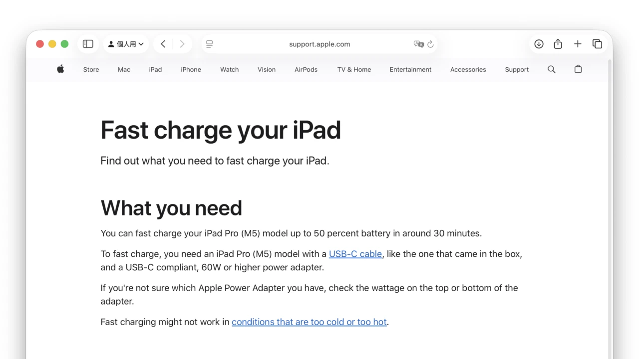 これらを利用すればiPad Pro (M5)を約30分で最大50%まで充電できるそうですが、高速充電はiPhoneと同じく気温が極端に寒い/熱くなり、デバイスが低温、または高温になりすぎると場合には充電速度が遅くなったり、高速充電が機能しない場合があるそうなので注意してください。