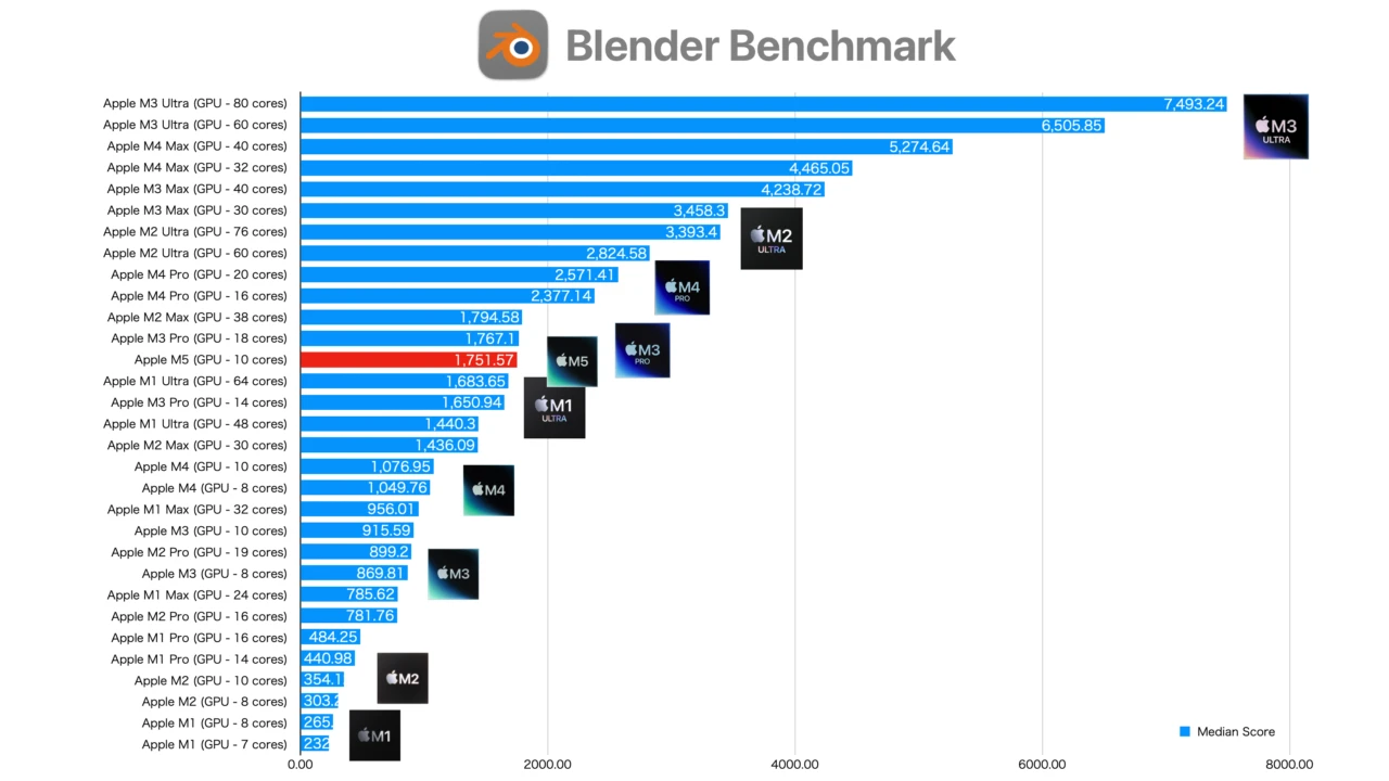 Apple M5 (10コアGPU)のBlender 3DレンダリングベンチマークはM1 Ultra (64コアGPU)を上回り、M3 Pro (18コアGPU)に並ぶスコアになっています。詳細は以下から。