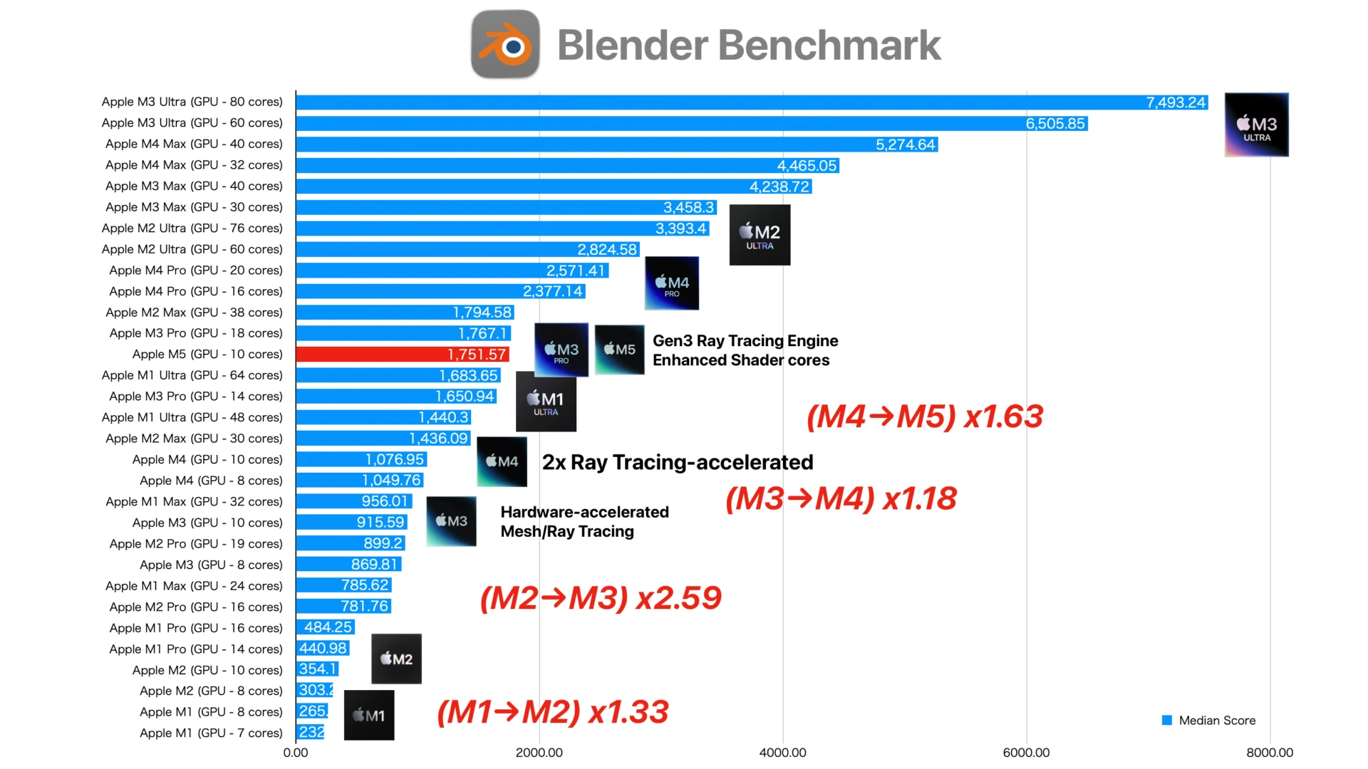 M5チップは第3世代のレイトレーシング・エンジンと強化されたシェーダコアにより、1世代前のM4チップからのアップデートでもM2からM3チップに次ぐスコアアップで、M1からM5チップへのアップデートでは約6.6倍、M2からM5は約5倍、M3からでも約1.9倍の3Dレンダリングパフォーマンスを得られることになるので、