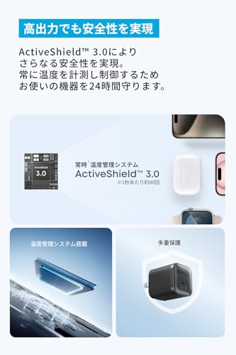 単ポート最大67W、3ポートでも合計64.5W出力で3台のデバイスを同時に充電することが可能なUSB急速充電器。