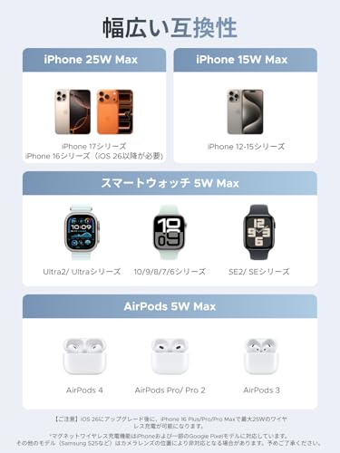今年09月に発売されたiPhone 17/16(iOS 26)のQi2 25Wワイヤレス充電に対応した3-in-1ワイヤレス充電器。