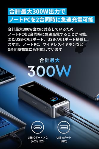 2台のノートPCを同時に充電可能な合計最大300W出力に加え、2つのUSB-Cポートから最大250W入力で本体を急速充電可能なモバイルバッテリー。ブラックフライデーセールではありませんが、発売記念の20%OFF割引が継続しています。