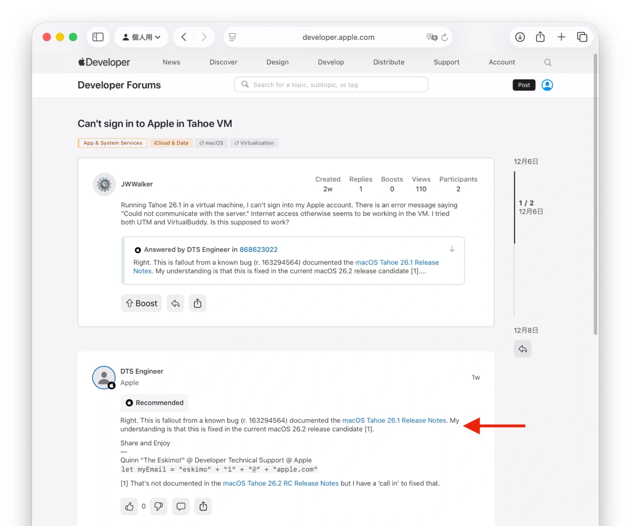 macOS仮想マシン上でAppleアカウントを利用したiCloudサービスや関連アプリの機能が利用できなくなっていましたが、AppleのDTS(Developer Technical Support)によると、この不具合は12月12日にリリースされた「macOS 26.2 Tahoe (25C56)」で修正されたそうです。