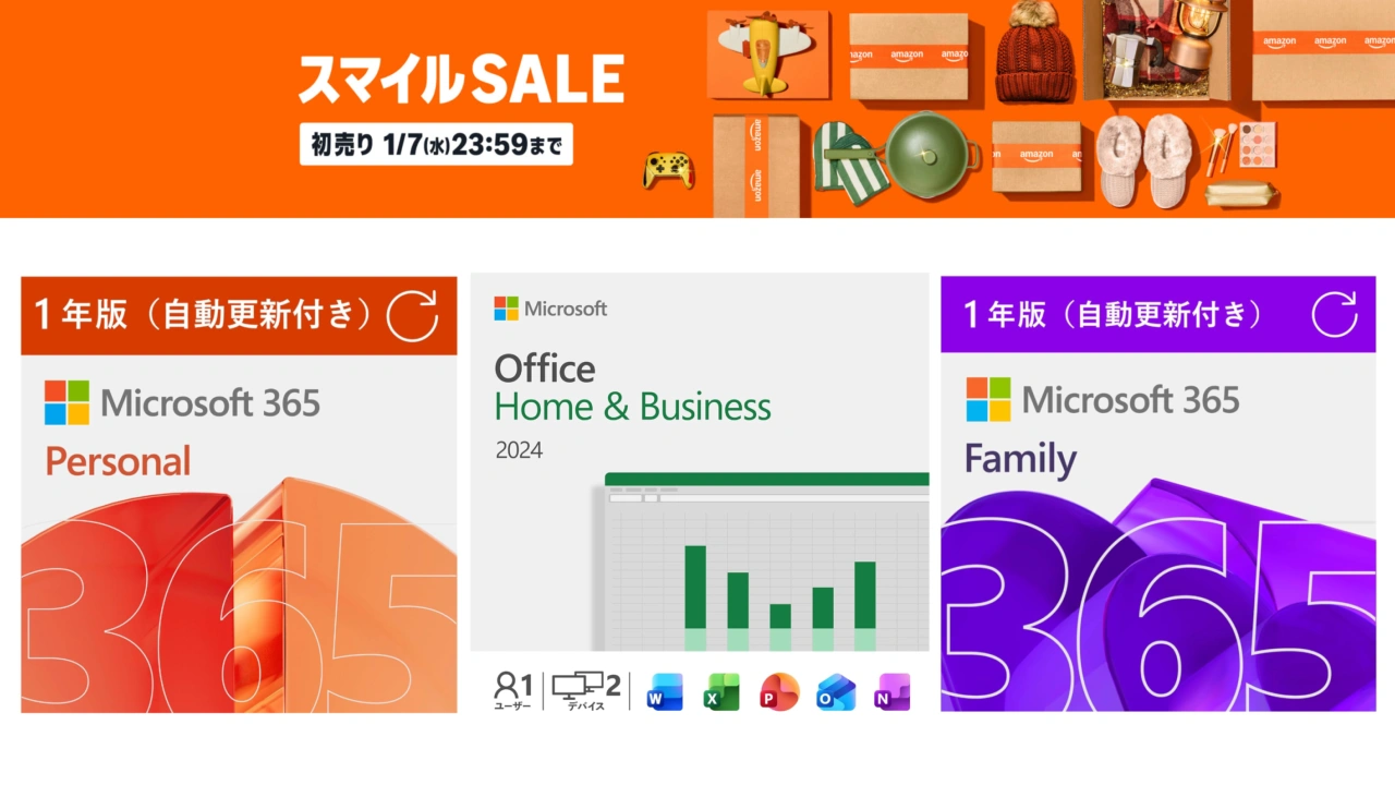Amazon Japanは本日2026年01月07日23時59分まで、新年に必要な家電やファッション、食料品などの商品を特別価格で提供する「AmazonスマイルSALE 初売り」を開催していますが、このセールの中で開催されているデジタルPCソフトセールで、Microsoft 365やOfficeがセールとなっています。
