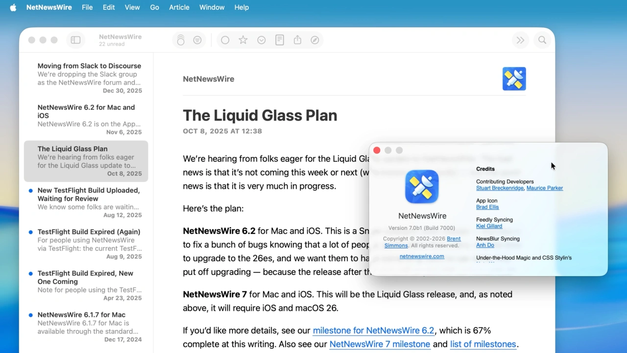 Simmonsさんは現地時間2026年01月08日、このNNWのMac版をmacOS 26 TahoeのLiquid Glass UIに対応させるため、次期メジャーアップデートのBeta版となる「NetNewsWire v7.0.0 Beta 1」を公開しています。