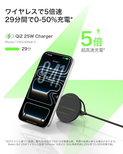 Amazon Japanは明日2026年02月02日まで、新学期に必要な家電やファッション、食料品などの商品を特別価格で提供する「AmazonスマイルSALE」セールを開催していますが、スマイルSALEにあわせてiPhone 17やiOS 26以降のiPhone 16シリーズを最大25Wでワイヤレス充電できる、Qi2 25W対応ワイヤレス充電器がタイムセールとなっています。