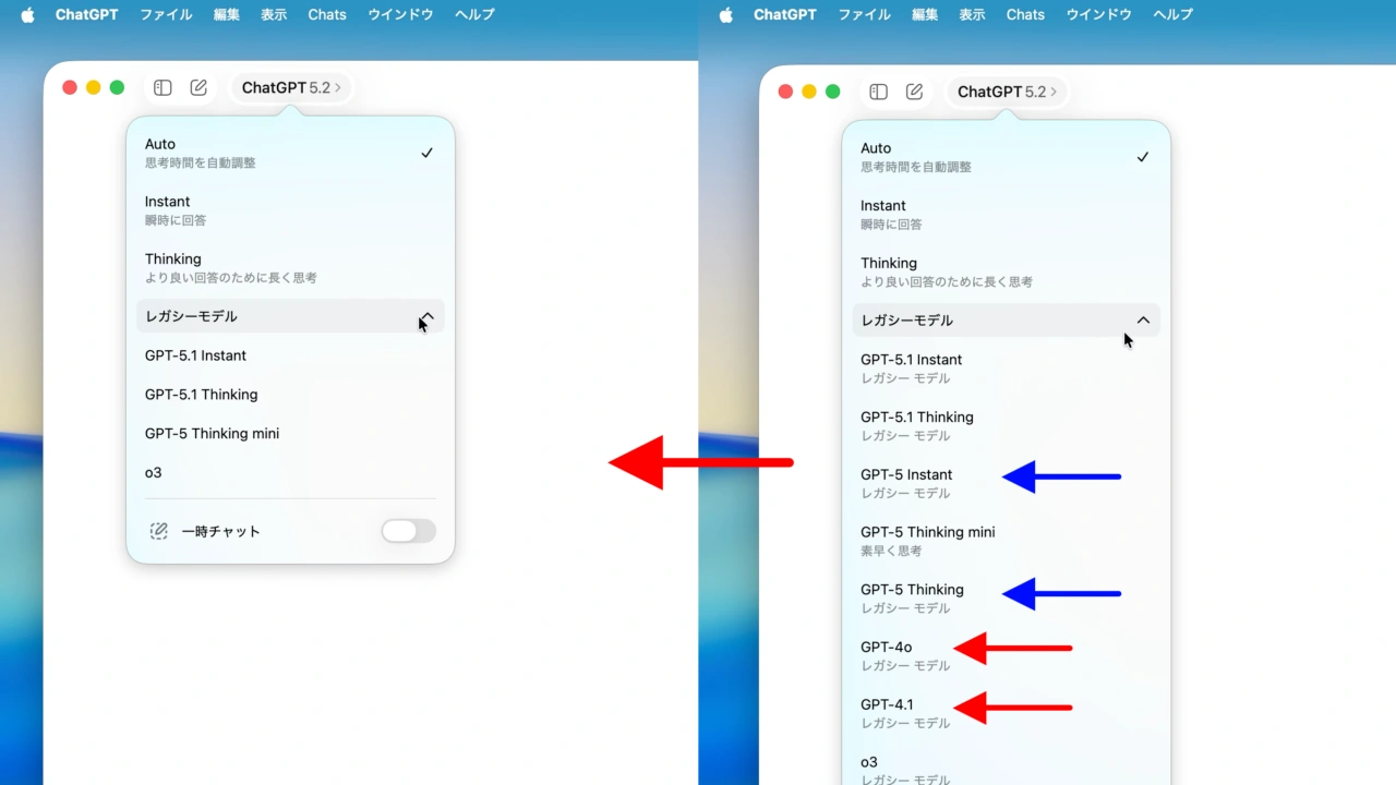 ChatGPT内でGPT-4としていた会話/チャットはGPT-5.2へ置き換わり、同時にGPT-5.1と並行して公開してきたGPT-5 (Instant and Thinking)の提供も終了したそうなので、気になる方は過去のGPTとの会話をチェックしてみてください。
