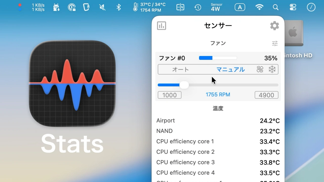 StatsはポーランドのSerhiy Mytrovtsiyさんが2019年からオープンソースで開発しているMac用のシステムモニタアプリで、MacのCPUやGPU、RAM、ディスク、ネットワーク使用率や温度/ファンセンサー、バッテリー情報をメニューバーに表示してくれますが、このStatsがv2.12.0でApple Silicon M3/M4のファン制御に対応しています。