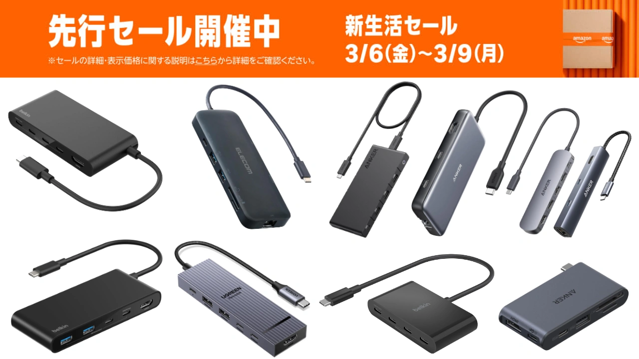 Amazonの新生活応援セールで、MacBook Neoでも役立ちそうなAnkerやBelkin、UGREEN、エレコムなどのUSB-Cハブがセールとなっています。詳細は以下から。