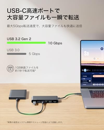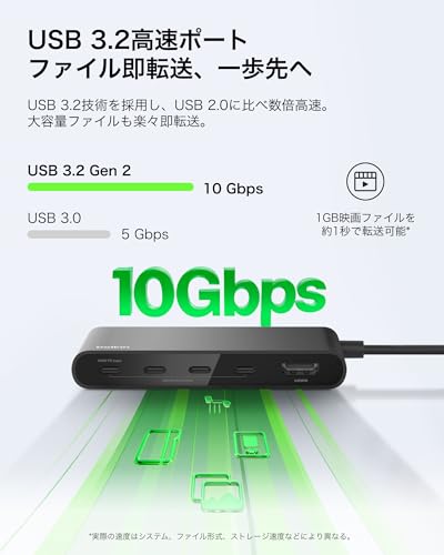 USB-C (10Gbps) x1とUSB-A x2、4K@60Hz対応のHDMI、Ethernet、SD/microSDカードリーダーを備えたUSB-Cハブ。