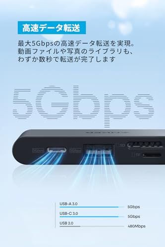 USB-PD、USB-C (5Gbps) x1、USB-A (5Gbps) x2、4K@60Hz出力対応のHDMIポート、SD/microSDカードリーダーを搭載したUSB-Cハブ。