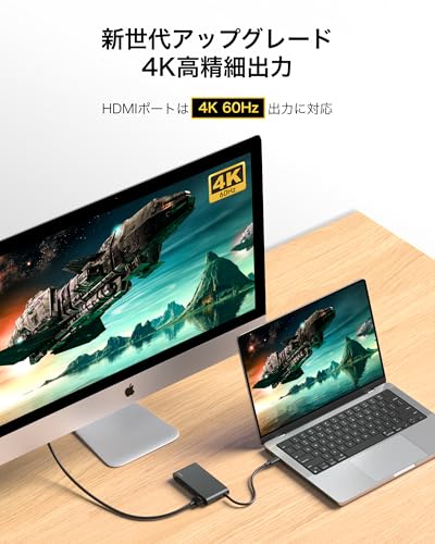 USB-C PDポートとUSB-C (5Gbps) x1とUSB-A x1、USB-A 2.0 x2、4K@60Hz対応のHDMI x2、Ethernetを備えたUSB-Cハブ。