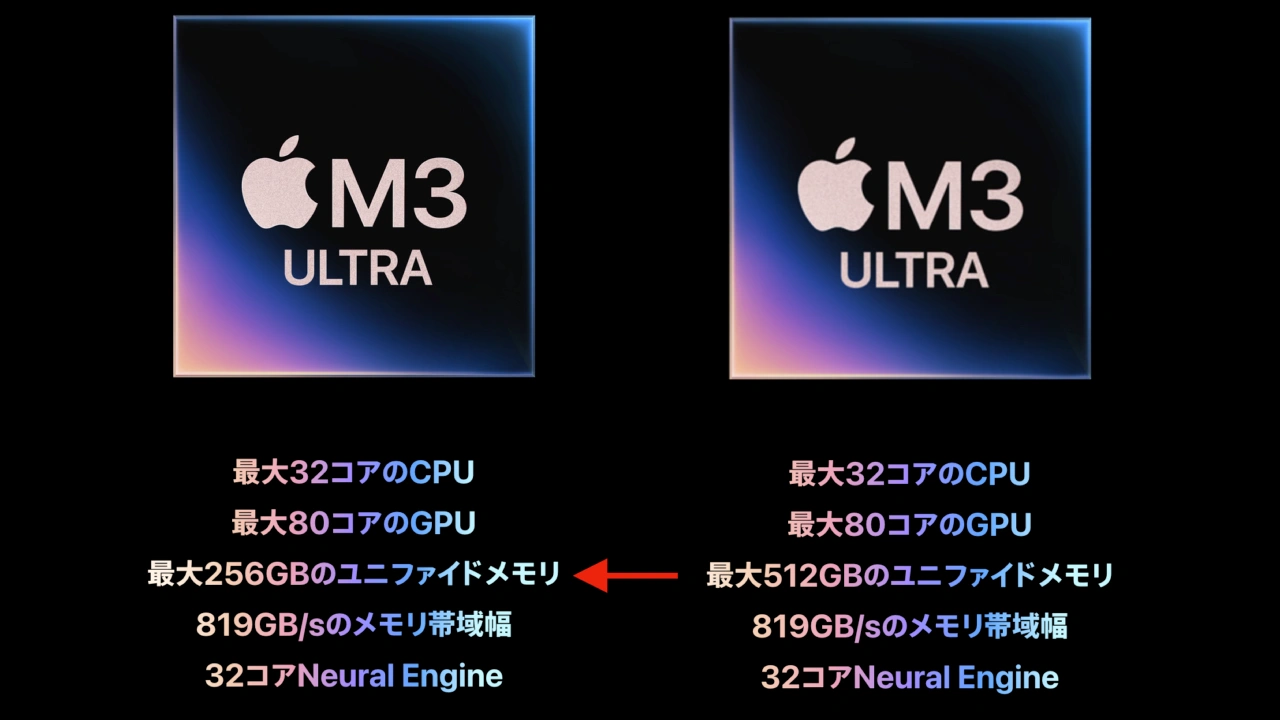 AppleがM3 Ultraチップを搭載した「Mac Studio」のオプションから512GBユニファイドメモリを削除しています。詳細は以下から。