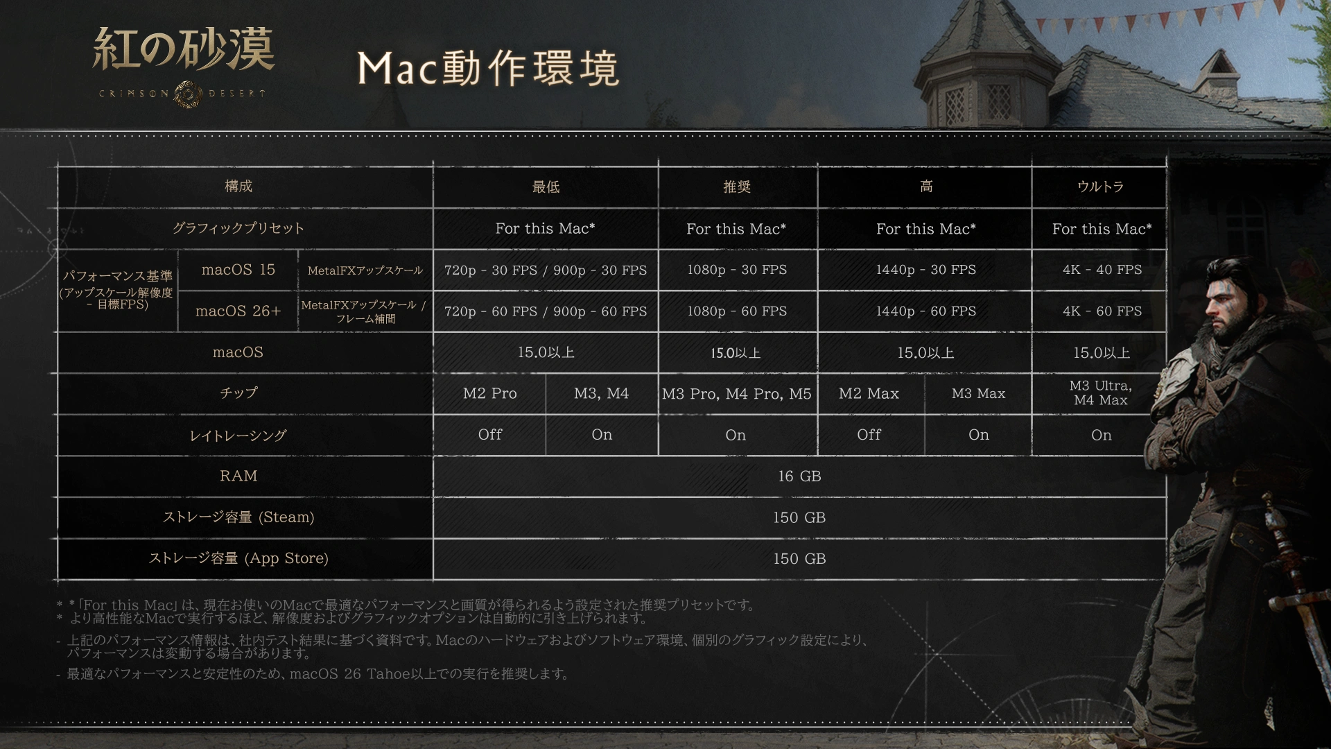 また、Mac App Storeでは、紅の砂漠はApple M1チップ以降のMacで動作すると記載されているものの、実際の最小システム要件は「Cyberpunk 2077: Ultimate Edition」と同じく、16GBユニファイドメモリを搭載したM1 ProやM3, M4チップとmacOS 15.0 Sequoia搭載のMacで900p/30fps、