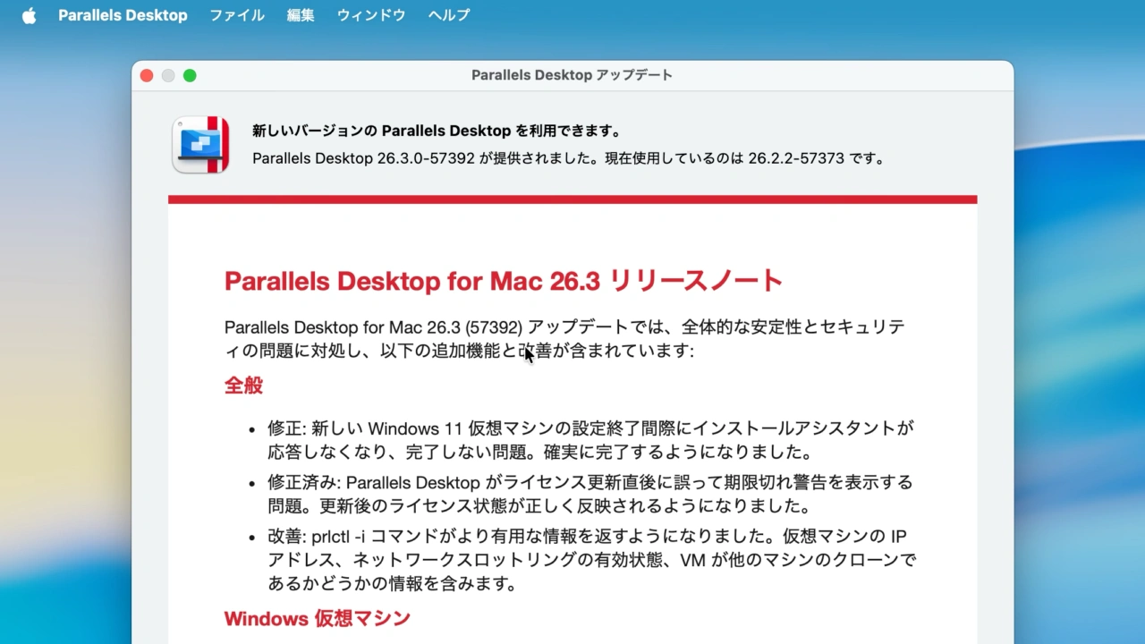 Parallels Desktop for Mac 26.3 (57392) アップデートでは、全体的な安定性とセキュリティの問題に対処し、以下の追加機能と改善が含まれています: