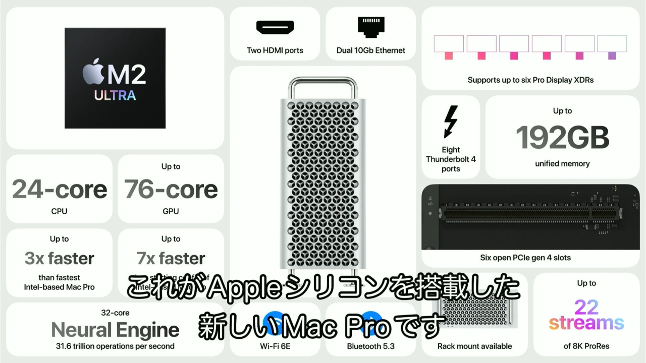 現在のデザインのMac Proは2019年06月のWWDC19で発表されたタワー型の「Mac Pro (2019)」をベースに、プロセッサにApple M2 Ultraチップを採用し、Mac StudioにはないPCIe拡張が可能な「Mac Pro (2023)」でしたが、ここ3年はアップデートされないまま販売が続けられてきました。