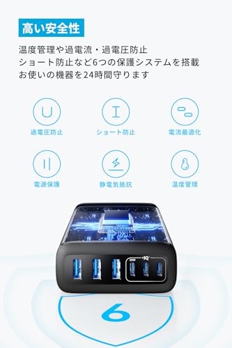 USB-A x3とUSB-C x3の合計6ポートを搭載し合計最大112W出力のUSB充電器。