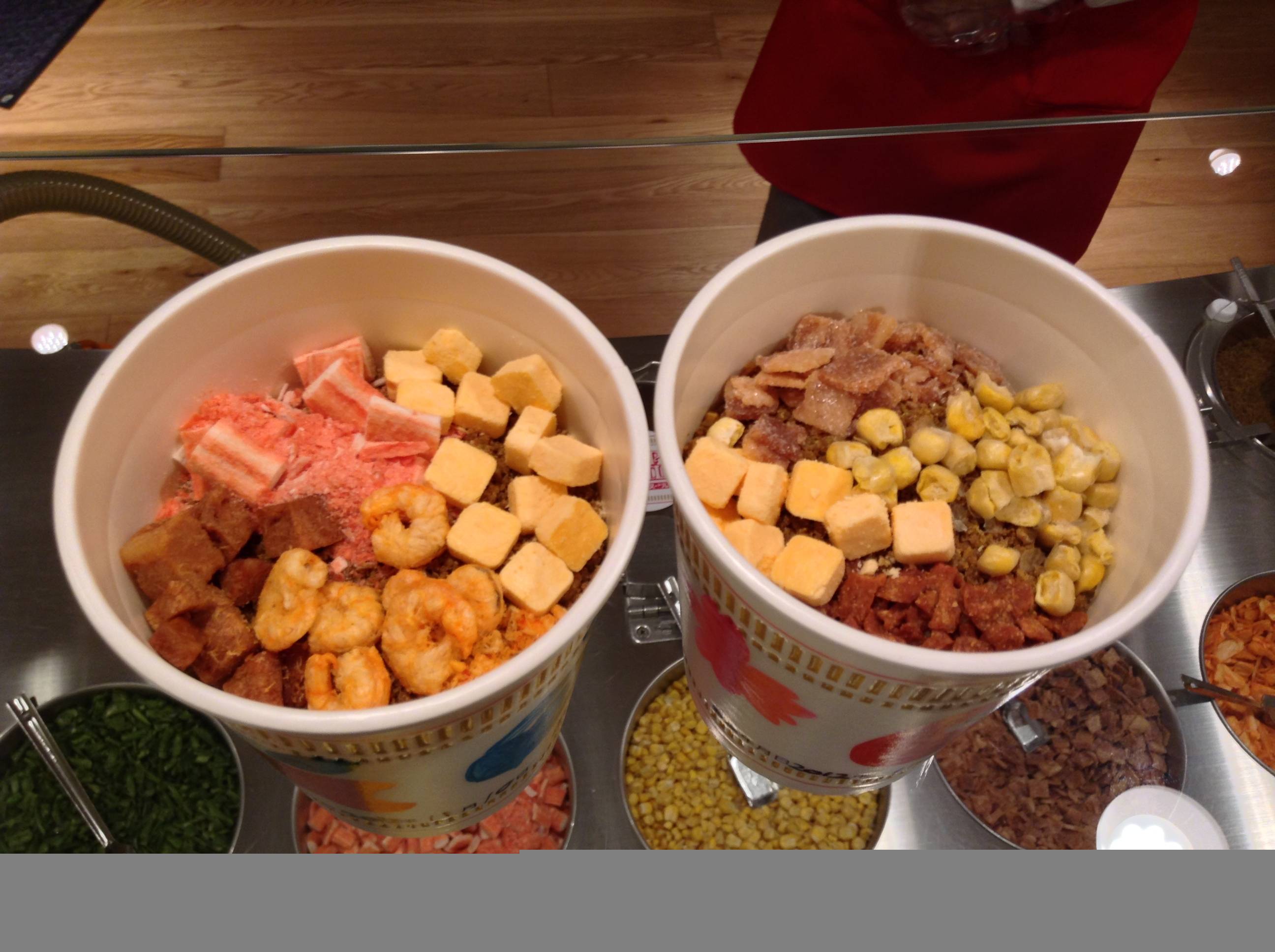 外のカップにお絵描きした後、具と味(シーフード、カレー、ノーマル)を選んで作れるよ